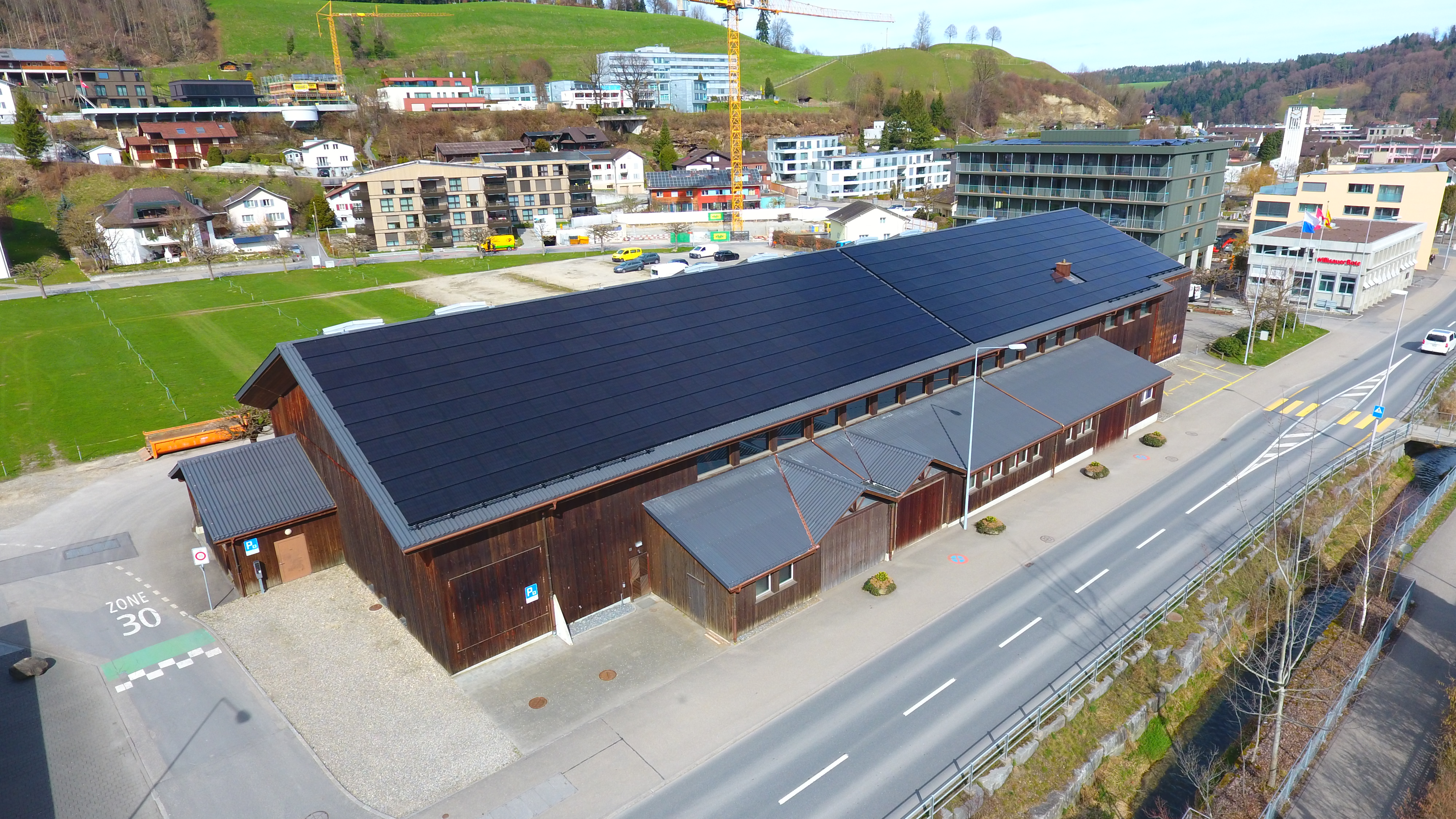 Im Zuge der energetischen Dachsanierung wurde auf der Südseite der Halle eine leistungsstarke Photovoltaik-Anlage realisiert. Damit setzt die Stadt Willisau ein klares Zeichen für Nachhaltigkeit und zukunftsorientierte Energieversorgung. Die Anlage produziert umweltfreundlichen Solarstrom direkt vor Ort und leistet einen wertvollen Beitrag zur Reduktion des Energieverbrauchs aus konventionellen Quellen.